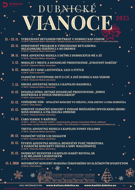 Už v nedeľu 30. novembra rozžiarime naše mesto prvou adventnou sviecou a tým odštartujeme magický program Dubnických Vianoc. Pripravte sa na obdobie plné svetiel, radosti a nezabudnuteľných zážitkov!